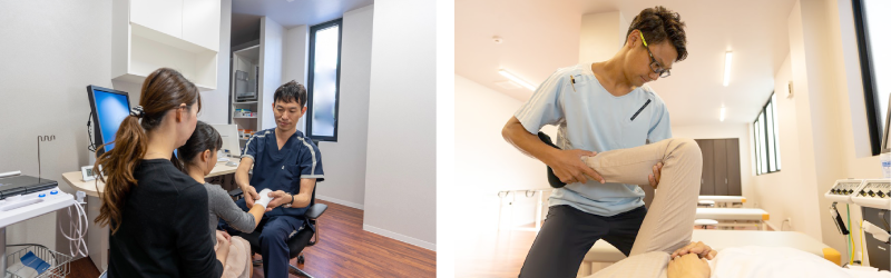 - 当院では、専門のリハビリスタッフ(理学療法士)による、リハビリテーションをお受けいただけます。日常生活の動作やスポーツの動作を取り戻すための運動器リハビリテーション(運動療法や物理療法等)も取り入れています。